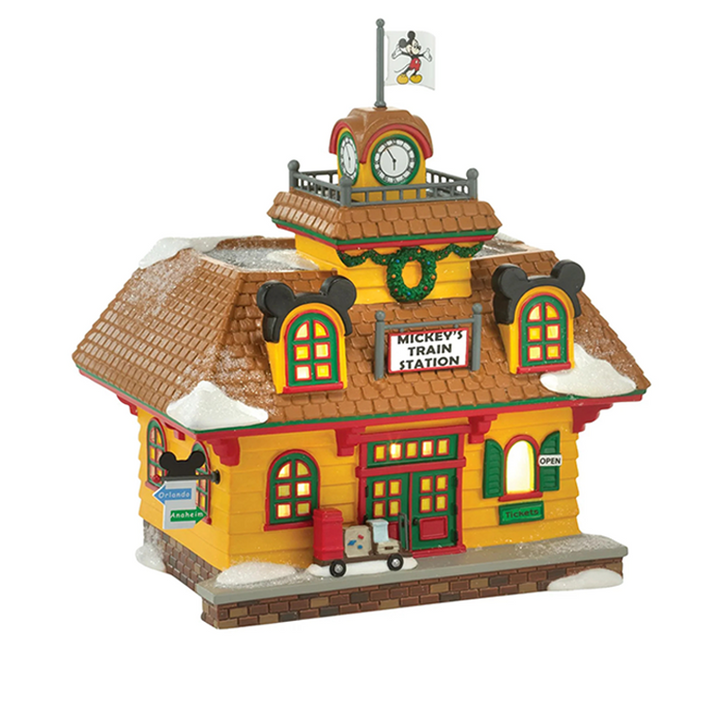 Mickey's Christmas Village Series, by Department 56. Mickey's Train Station, one of the charming, lit buildings from this series. This is a fun place to wait for the next train. Hand-crafted, hand-painted porcelain, includes light-cord with bulb.